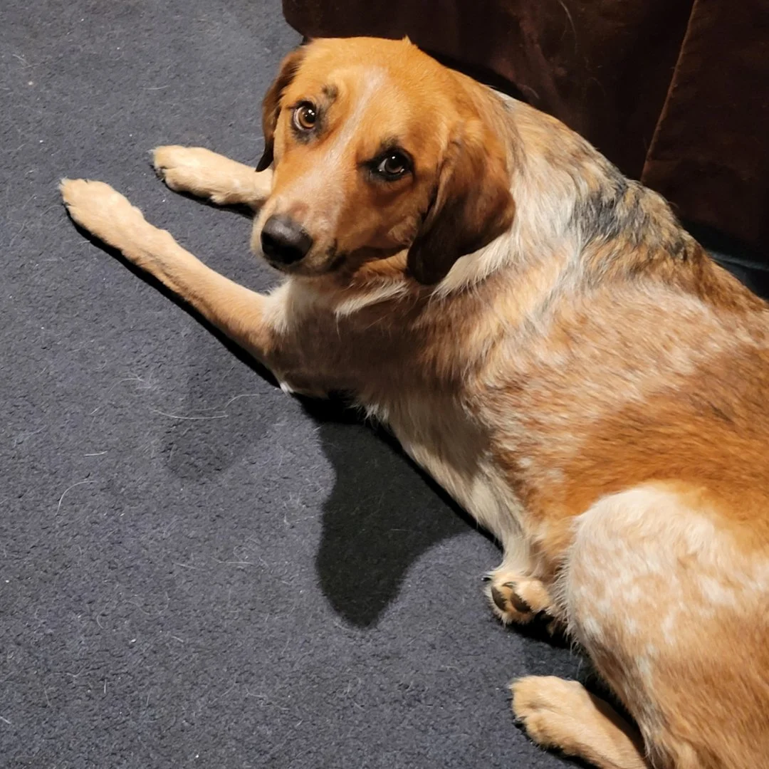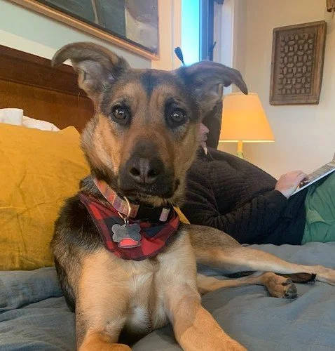Freya sits like a person on the stairs and the couch, greets you with full-body wiggles, and has the biggest puppy eyes. She’s two now and still acts like a puppy, with youthful energy and a sweet demeanor. She’s eager to please and very well behaved, picking up on training instantly with no reminders needed. She also watches TV more intently than any dog we’ve ever known. Freya is healthy and happy, and her favorite things include long nature walks with plenty of sniffing, sprinting around the backyard, and curling up under a blanket with us on the couch.