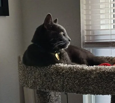 Geoffrey has lived with two dog siblings and puts on a good sassy black cat front, though we’ve caught him cuddling with both. Both Jo and Geoffrey know the sound of a cheese wrapper and come running, one of the few things they truly agree on, aside from hogging the bed. Jo especially loves her pupsicle (fondly called her “iPad”), her soccer ball, and cheese, while Geoffrey enjoys stealing guitar picks, climbing pant legs, and—of course—cheese. Both are healthy and doing well, with no ongoing medical or behavioral needs out of the ordinary.