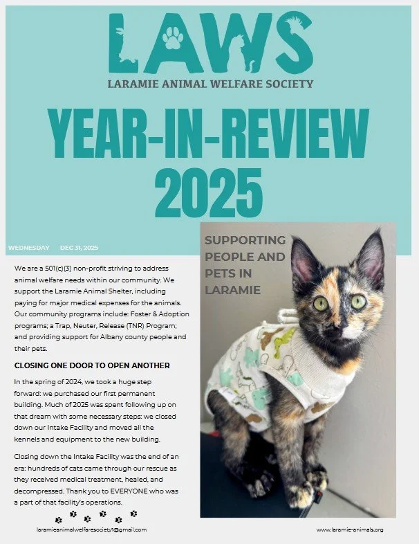 Laramie Animal Welfare Society is committed to transparency and responsible stewardship of the support we receive. As a small, volunteer-driven nonprofit, our reporting has grown alongside our organization. Below you’ll find the financial filings and impact reports currently available, with new documents added annually.
